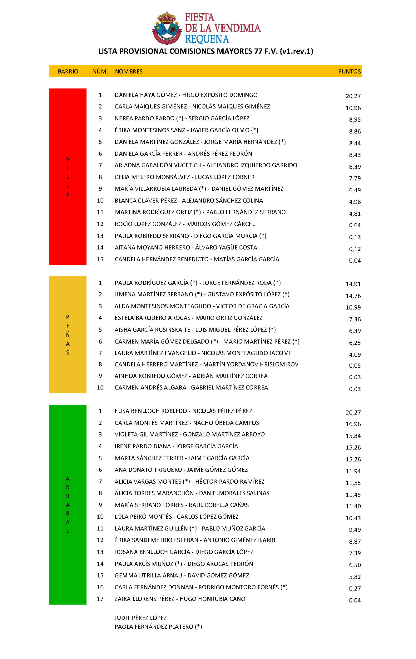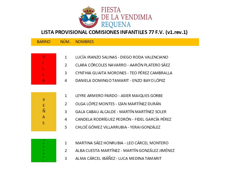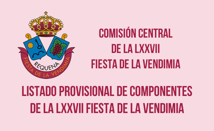 La Comisión Central de la LXXVII Fiesta de la Vendimia publica a continuación el listado PROVISIONAL de componentes admitidos en las comisiones mayores e infantiles.